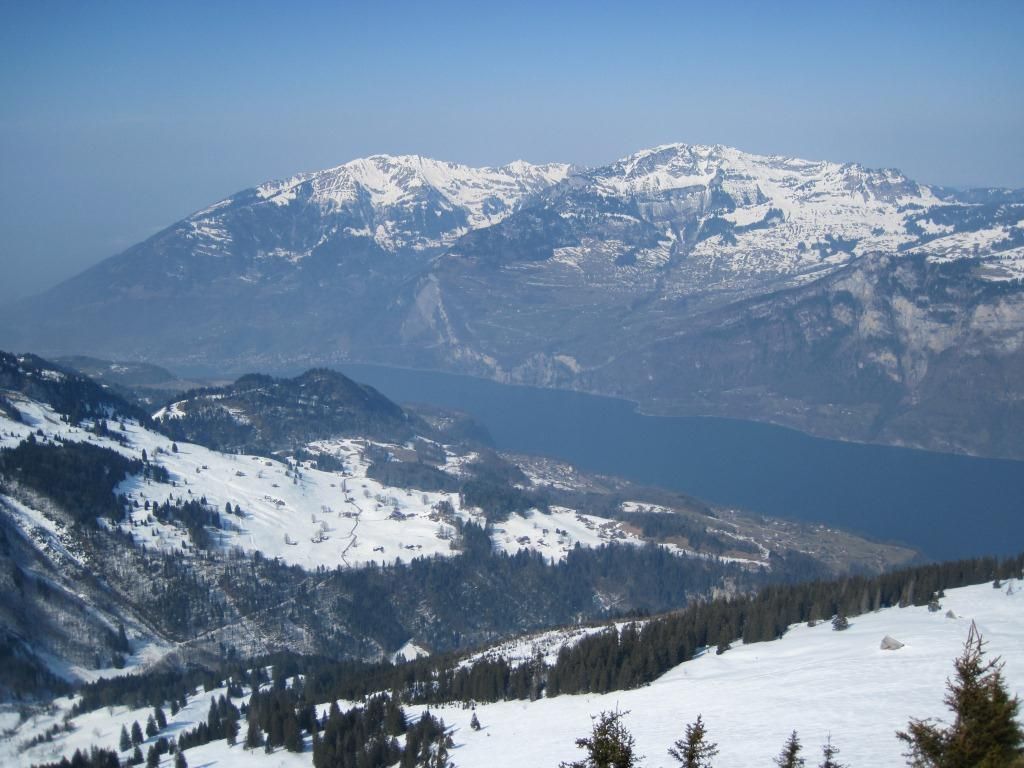 15/03/2015 - Un beau paysage avec vue sur le Walensee, les Churfirsten, dans l'ombre du Mürschtenstock. Un sommet débonnaire, rien de sensationnel mais certain très recommandable par gros enneigement si l'on peut skier jusqu'au Walensee. D'autant que la croupe de gauche se prête bien à une sortie par "gros" risque d'avalanche (le genre de truc peu pentu qui passe dans toutes les conditions)