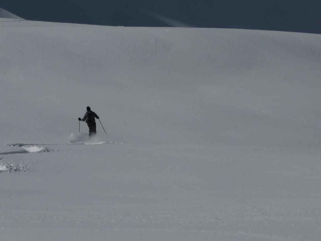 On a quand meme bien compris que ca a beau etre blanc, il y a 4 jours c'était tout vert, donc on essaie de viser un endroit plutôt herbeux. On pense que ca peut etre le cas vers le Firzstock. Mauvaise pioche, il y a des cailloux et le vent a balayé le reste. a mi-chemin, on decide de bifurquer vers l'Alpbigligenstöckli en esperant qu'il a était mieux abrité lors de la tempete des derniers. Re-belote et re-loose, l'itinéraire classique semble inskiable.